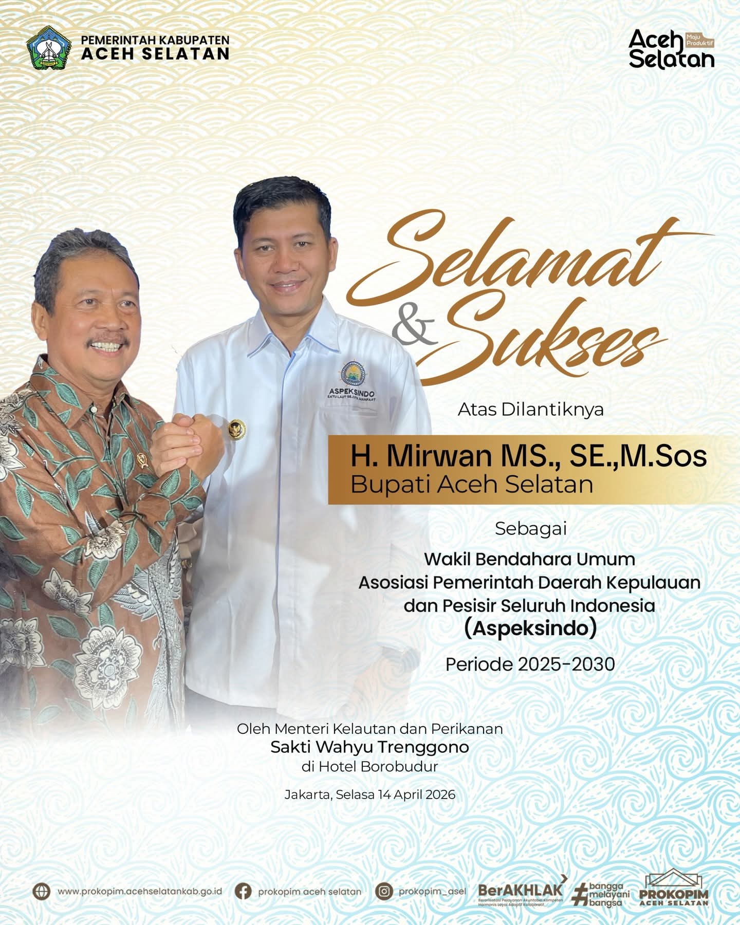 TheTapaktuanPost | Jakarta. Bupati Aceh Selatan, H. Mirwan resmi dipercaya mengemban amanah sebagai Wakil Bendahara Umum dalam kepengurusan Asosiasi Pemerintah selengkapnya..