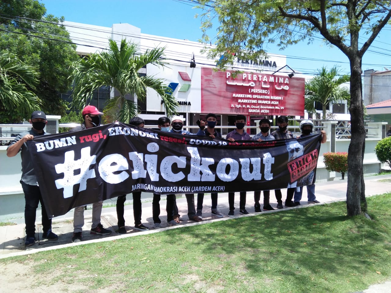 Massa yang membawa spanduk yang bertuliskan #ErickOut mulai bergerak pada pukul 11.00 WIB dan memulai unjuk rasa di Kantor Asuransi milik BUMN, yakni JiwaSraya Cabang Banda Aceh yang beralamat di Jalan Teungku Chik Ditiro. Setelah berorasi di kantor tersebut, massa berpindah ke GraPari Telkomsel (anak BUMN Telkom), Kantor Pertamina Aceh, Kantor perwakilan Bank Mandiri Aceh dan kantor perwakilan PLN Aceh.