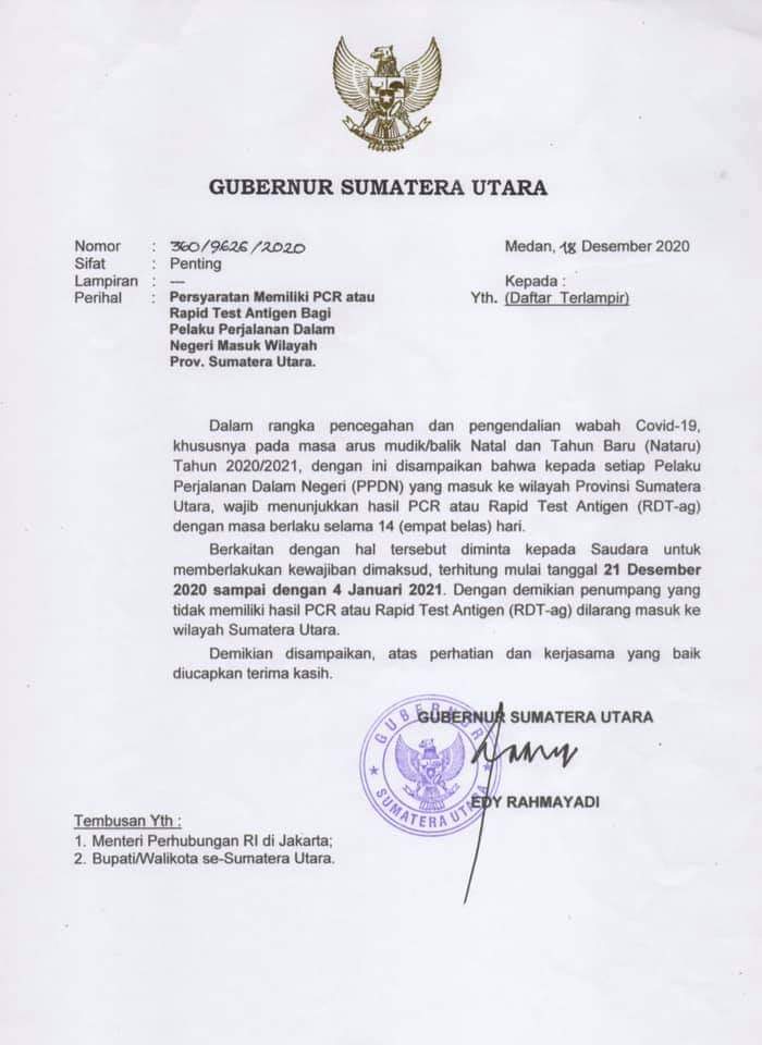 Surat tersebut berisi, dalam rangka pencegahan dan pengendalian wabah Covid-19, khususnya pada masa arus mudik Natal dan Tahun Baru, dengan ini disampaikan, bahwa setiap pelaku perjalanan dalam negeri yang masuk ke wilayah Sumatera Utara, wajib menunjukkan hasil PCR atau Rapid Test Antigen (RDT-ag) dengan masa berlaku selama 14 hari.