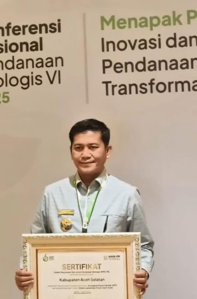 Penghargaan diterima langsung oleh Bupati Aceh Selatan, H. Mirwan, pada acara Konferensi Nasional ke-6 Pendanaan Ekologis yang berlangsung di Hotel Arya Duta, Jakarta, Selasa, (5/8/2025).