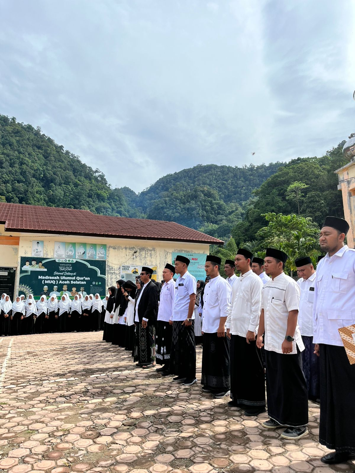 Upacara Hari Santri di MUQ Aceh Selatan berlangsung meriah namun tetap khidmat. Selain upacara bendera, kegiatan juga diisi dengan menyanyikan Mars Hari Santri serta doa bersama.
